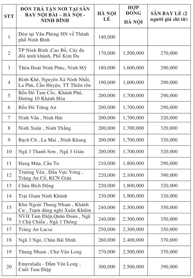 | Nội Bài đi Hoa Lư (Tam Cốc) | 980.000 đ | 1.080.000 đ | 2.680.000 đ |