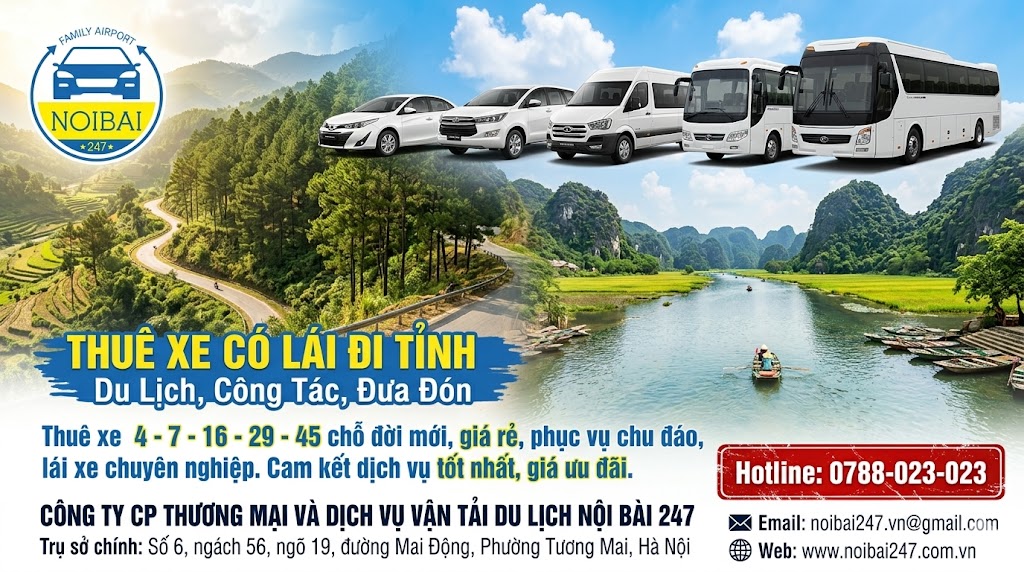 Dịch vụ thuê xe có tài xế đi tỉnh đang ngày càng phổ biến ở Việt Nam, mang lại sự tiện lợi cho nhiều đối tượng từ cá nhân đến doanh nghiệp. Với nhu cầu di chuyển tăng cao, việc chọn dịch vụ này giúp tiết kiệm thời gian, giảm rủi ro và đảm bảo an toàn trên đường. Công ty CP Thương Mại Và Dịch Vụ Vận Tải Du Lịch Nội Bài 247 là một trong những đơn vị hàng đầu, cung cấp xe đời mới từ 4 đến 45 chỗ với giá cạnh tranh và tài xế chuyên nghiệp.